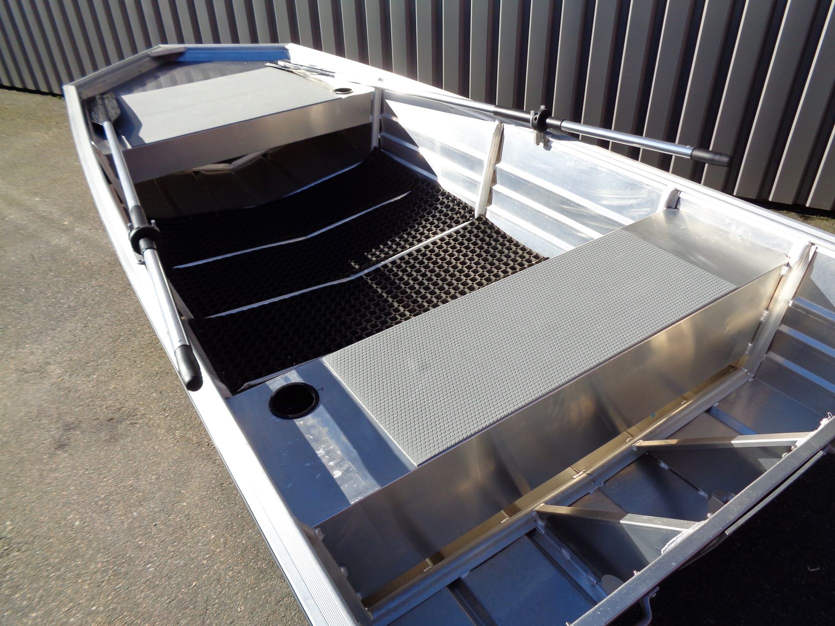 Ett brett skrov med liten bottenvinkel gör båten otroligt stabil och grundgående. Båten är även mycket lättdriven så den planar fint med en 6 hk motor. Den breda akterspegeln är utformad för att ge plats åt motor, trolling motor, ekolodsgivare m.m.