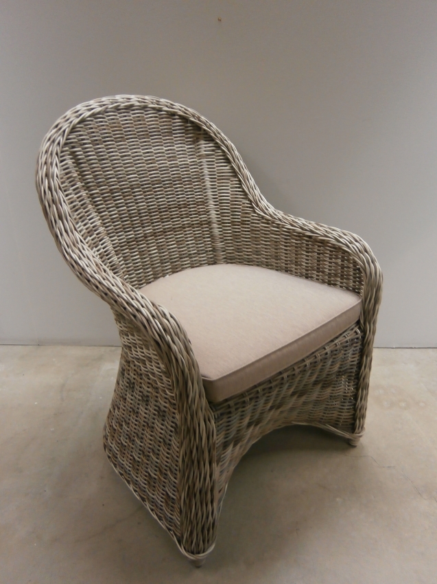 Flätad med en 5 mm tjock naturfärgad "Sandy beach" konstrottingfiber på aluminiumstomme levereras med beige dyna. Går att använda som relaxfåtölj alternativt som matgruppsstol.