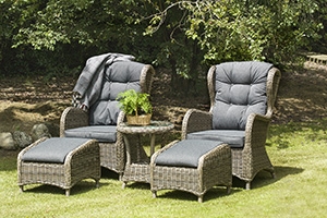 Newport med sina sköna öronlappsfåtöljer med tillhörande fotpallar och sidobord, stomme av vädertålig aluminium. Finns som två färgval med genomfärgad konstrotting och härligt tjocka dynor för maximal komfort